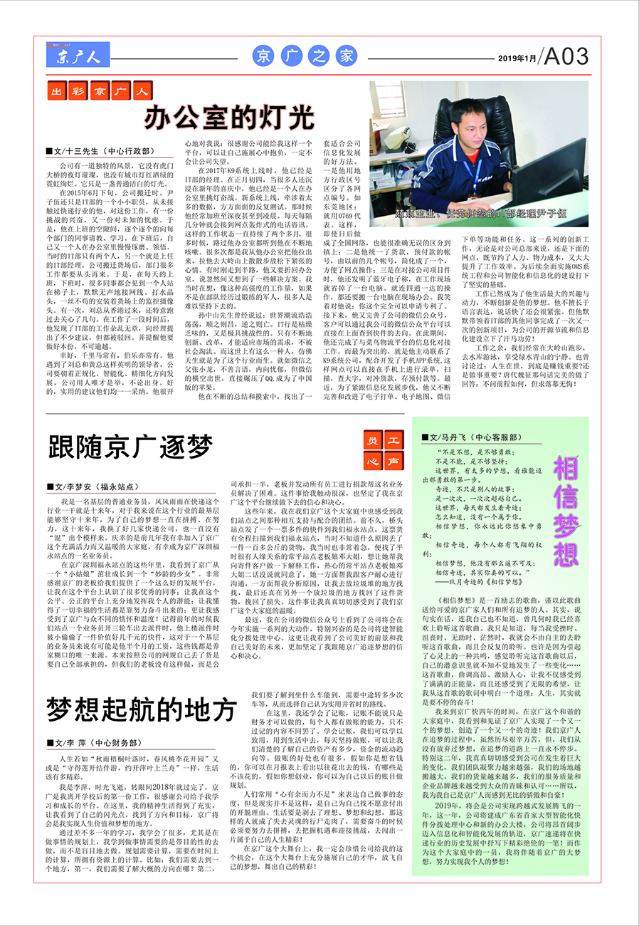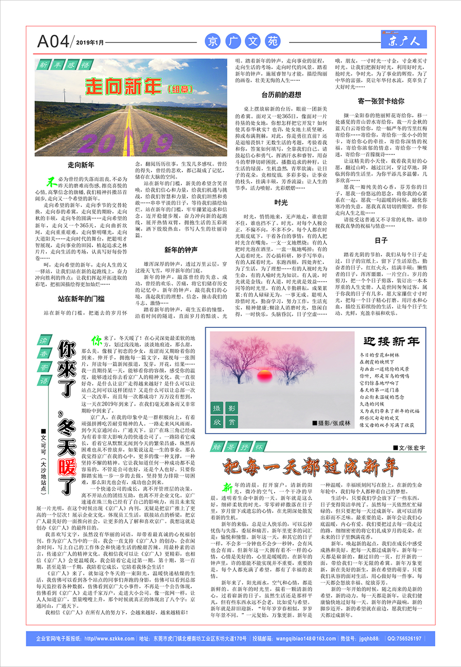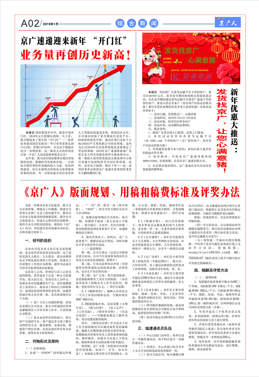 帶著2019年新年濃烈的喜慶訊息,京廣速遞內刊《京廣人》披著新年的朝陽,帶著幼芽萌發(fā)的稚氣和生機勃勃的活力,走進了您的視線。 或者它還沒站穩(wěn)腳跟,卻有著“初生牛犢不怕虎”的銳氣; 或者它還沒掌穩(wěn)舵槳,卻有著“我的地盤我做主”的新意; 或者它不會是您生活的全部,卻不能忽視它將帶給您的影響。 在這里,我們愿為您架設一條了解京廣、了解快遞行業(yè)動態(tài)的快速路,搭建一座展示個人、團隊風采的舞臺,鋪起一道溝通思想、交流經驗的彩虹,提供一個放松身心、品位生活的驛站。 我們將忠誠地傳承京廣的文化理念,敏銳地采集瞬間的思想火花,真實地記錄曲折的發(fā)展足跡,細致地講述于平凡中見偉大的經歷。 面對來自于您的關注與期待,我們“如臨深淵,如履薄冰”,卻也更堅定了不懈努力的信心。同時,我們深深地明白,載動航船揚帆前進的是泱泱之水,《京廣人》的成長壯大離不開您的支持和參與。 倉促的策劃,匆忙的趕稿,我們卻不敢有絲毫的放松;您等待閱讀的目光,友好真誠的指正,為我們憑添前進的動力。又或是我們太過貪心,總希望這第一次的親密接觸,就可以讓您賞心悅目,樂在其中;更希望在今后的每一次見面,都會讓您開卷有益,與您情思共鳴!