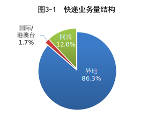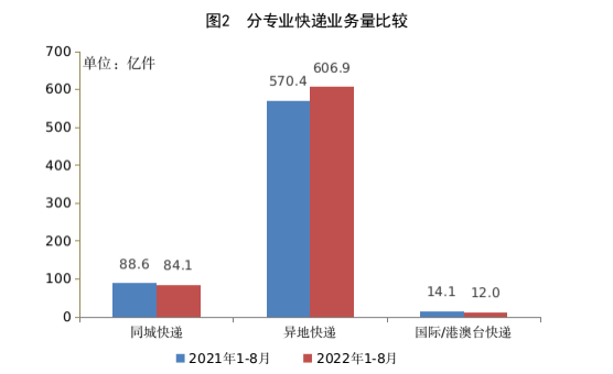 1-8月,同城、異地、國際/港澳臺快遞業(yè)務量分別占全部快遞業(yè)務量的12.0%、86.3%和1.7%;業(yè)務收入分別占全部快遞業(yè)務收入的6.6%、49.2%和10.8%。與去年同期相比,同城快遞業(yè)務量的比重下降1.2個百分點,異地快遞業(yè)務量的比重上升1.6個百分點,國際/港澳臺快遞業(yè)務量的比重下降0.4個百分點。