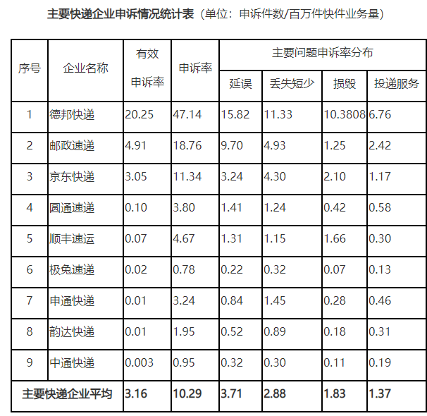 注:按主要快遞企業(yè)有效申訴率降序排列。