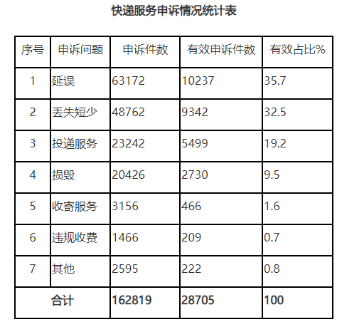 1.快遞服務(wù)申訴問題數(shù)量與類別情況。用戶對快遞服務(wù)問題申訴162819件,其中有效申訴28705件,涉及的主要問題依次是快件延誤、快件丟失短少和投遞服務(wù),分別占有效申訴總量的35.7%、32.5%和19.2%。