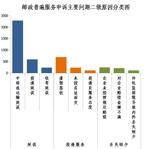 2.郵政普遍服務(wù)申訴主要問題二級原因情況。郵件延誤申訴中主要占比較多的是中轉(zhuǎn)或運輸延誤,投遞服務(wù)申訴中主要占比較多的是虛假簽收,郵件丟失短少申訴中主要占比較多的是企業(yè)未按照規(guī)定賠償。