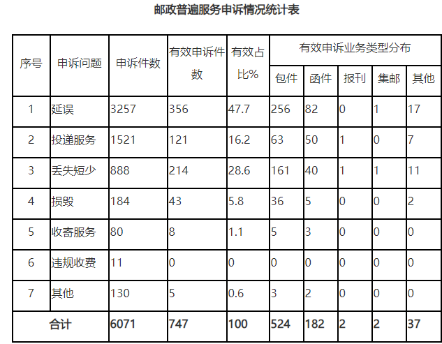 1.郵政普遍服務(wù)申訴問題數(shù)量與類別情況。用戶對郵政普遍服務(wù)問題申訴6071件,其中有效申訴747件,涉及的主要問題依次是郵件延誤、郵件丟失短少和投遞服務(wù),分別占有效申訴總量的47.7%、28.6%和16.2%。