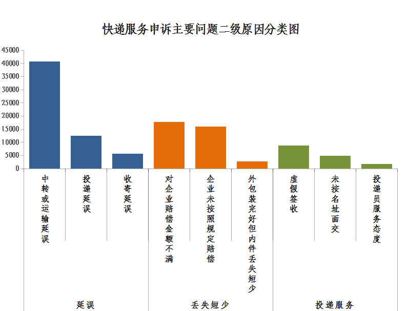 2.快遞服務(wù)申訴主要問題二級原因情況。快件延誤申訴中主要占比較多的是中轉(zhuǎn)或運輸延誤,快件丟失短少申訴中主要占比較多的是對企業(yè)賠償金額不滿,投遞服務(wù)申訴中主要占比較多的是虛假簽收。