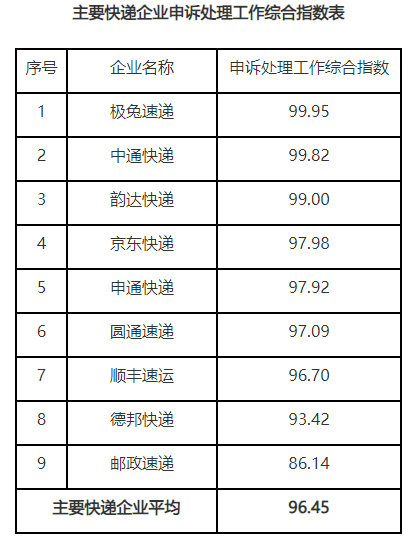 主要快遞企業(yè)申訴處理工作綜合指數(shù)平均為96.45,高于平均值的有7家,低于平均值的有2家。