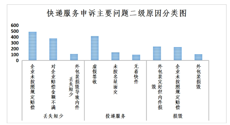 快遞丟失短少申訴中主要占比是企業(yè)未按照規(guī)定賠償,投遞服務(wù)申訴中主要占比是虛假簽收,損毀申訴中主要占比是外包裝完好但內(nèi)件損毀。