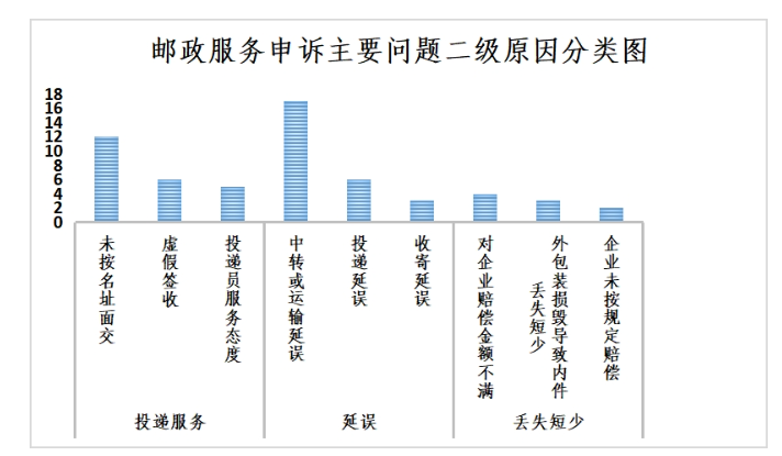 郵件投遞服務(wù)申訴中主要占比是未按名址面交,延誤申訴中主要占比是中轉(zhuǎn)或運(yùn)輸延誤,丟失短少申訴中主要占比是對(duì)企業(yè)賠償金額不滿。