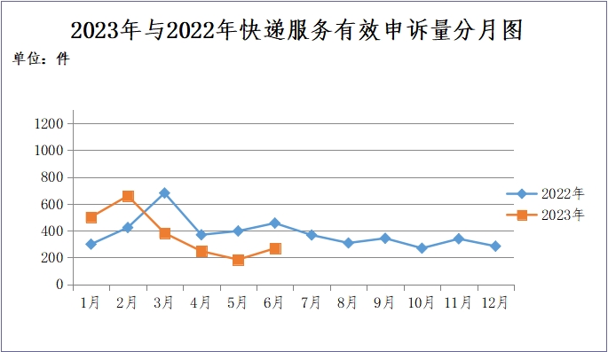 6月,消費者對快遞服務問題有效申訴268件,環(huán)比上升45.6%,同比下降41.2%。