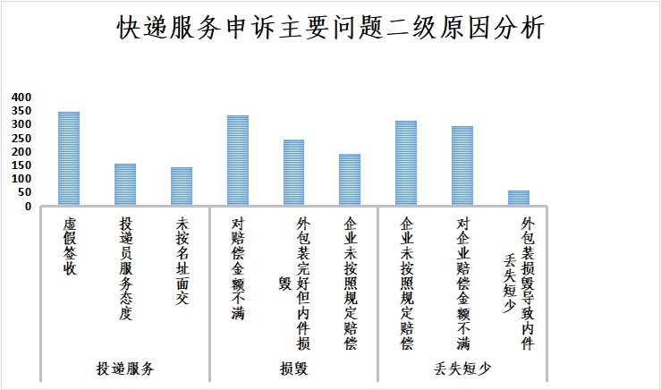快件投遞服務申訴中主要占比是虛假簽收,損毀申訴中主要占比是對賠償金額不滿,丟失短少申訴中主要占比是企業(yè)未按照規(guī)定賠償。