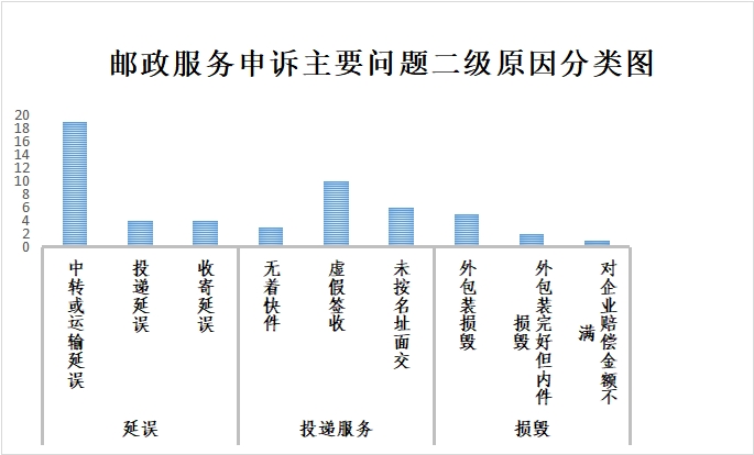 郵件延誤申訴中主要占比是中轉(zhuǎn)或運輸延誤,投遞服務申訴中主要占比是虛假簽收,損毀申訴中主要占比是對外包裝損毀。