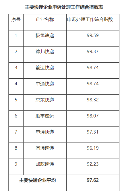 主要快遞企業(yè)申訴處理工作綜合指數(shù)平均為97.62,高于平均值的有6家,低于平均值的有3家。