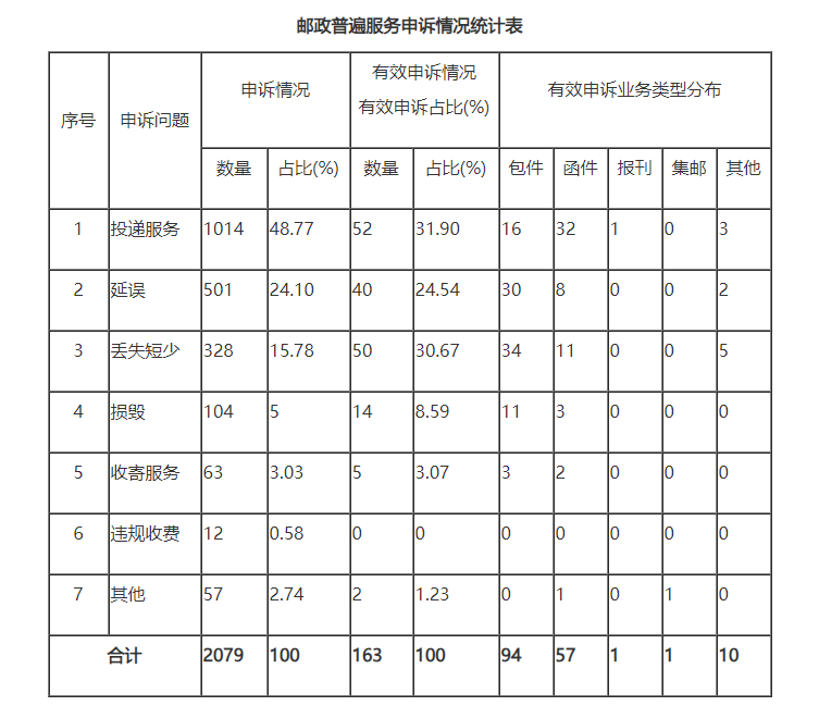 1.郵政普遍服務(wù)申訴問題數(shù)量與類別情況。用戶對郵政普遍服務(wù)問題申訴2079件,其中有效申訴163件,占比7.84%。有效申訴涉及的主要問題依次是投遞服務(wù)、郵件丟失短少和郵件延誤,分別占有效申訴總量的31.9%、30.67%和24.54%。