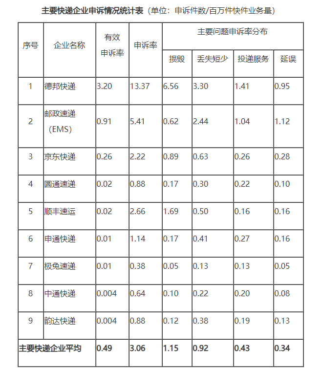 3.主要快遞企業(yè)申訴率情況。主要快遞企業(yè)申訴率(百萬件快件業(yè)務(wù)量)平均為3.06,有效申訴率平均為0.49。用戶對快遞服務(wù)申訴主要問題中,快件損毀申訴率平均為1.15,快件丟失短少申訴率平均為0.92,投遞服務(wù)申訴率平均為0.43,快件延誤申訴率平均為0.34。