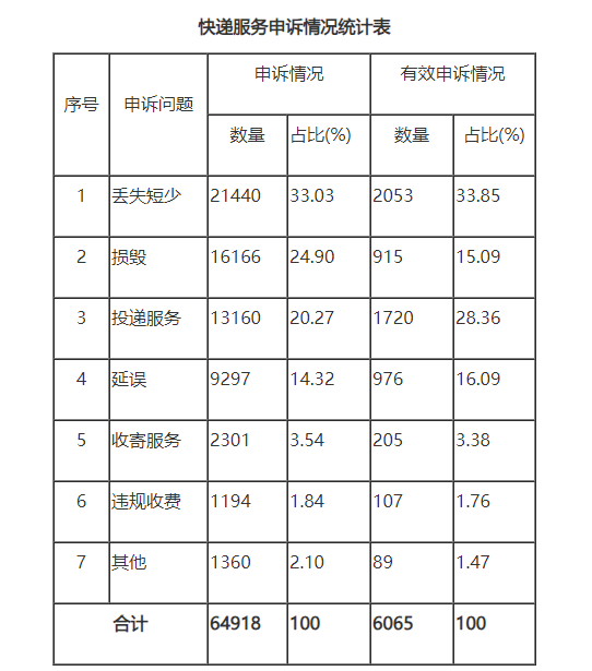 1.快遞服務(wù)申訴問題數(shù)量與類別情況。用戶對快遞服務(wù)問題申訴64918件,其中有效申訴6065件,占比9.34%。有效申訴涉及的主要問題依次是快件丟失短少、投遞服務(wù)和快件延誤,分別占有效申訴總量的33.85%、28.36%和16.09%。