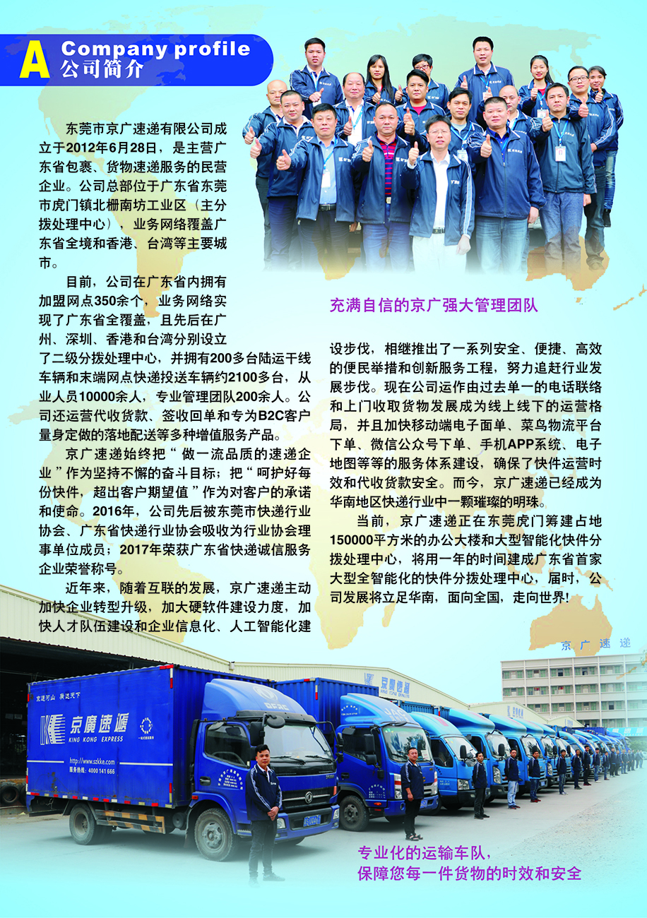 東莞市京廣速遞有限公司成立于2012年6月28日,是主營廣東省包裹、貨物速遞服務的民營企業(yè)。公司總部位于廣東省東莞市虎門鎮(zhèn)北柵南坊工業(yè)區(qū)(主分撥處理中心),業(yè)務網(wǎng)絡覆蓋廣東省全境和香港、臺灣等主要城市。 目前,公司在廣東省內(nèi)擁有加盟網(wǎng)點350余個,業(yè)務網(wǎng)絡實現(xiàn)了廣東省全覆蓋,且先后在廣州、深圳、香港和臺灣分別設立了二級分撥處理中心,并擁有200多臺陸運干線車輛和末端網(wǎng)點快遞投送車輛約2100多臺,從業(yè)人員10000余人,專業(yè)管理團隊200余人。公司還運營代收貨款、簽收回單和專為B2C客戶量身定做的落地配送等多種增值服務產(chǎn)品。 京廣速遞始終把“做一流品質的速遞企業(yè)”作為堅持不懈的奮斗目標;把“呵護好每份快件,超出客戶期望值”作為對客戶的承諾和使命。2016年,公司先后被東莞市快遞行業(yè)協(xié)會、廣東省快遞行業(yè)協(xié)會吸收為行業(yè)協(xié)會理事單位成員;2017年榮獲廣東省快遞誠信服務企業(yè)榮譽稱號。 近年來,隨著互聯(lián)的發(fā)展,京廣速遞主動加快企業(yè)轉型升級,加大硬軟件建設力度,加快人才隊伍建設和企業(yè)信息化、人工智能化建設步伐,相繼推出了一系列安全、便捷、高效的便民舉措和創(chuàng)新服務工程,努力追趕行業(yè)發(fā)展步伐。公司運作由過去單一的電話聯(lián)絡和上門收取貨物發(fā)展成為現(xiàn)在線上線下的運營格局,并且加快移動端電子面單、菜鳥物流平臺下單、微信公眾號下單、手機APP系統(tǒng)、電子地圖等等的服務體系建設,確保了快件運營時效和代收貨款安全。而今,京廣速遞已經(jīng)成為華南地區(qū)快遞行業(yè)中一顆璀璨的明珠。 目前,京廣速遞正在東莞虎門懷德管理區(qū)籌建占地150000平方米的辦公大樓和大型智能化快件分撥處理中心,將用一年的時間建成廣東省首家大型全智能化的快件分撥處理中心,屆時,公司發(fā)展將立足華南,面向全國,走向世界!