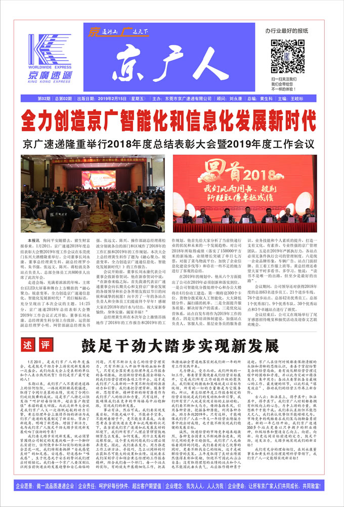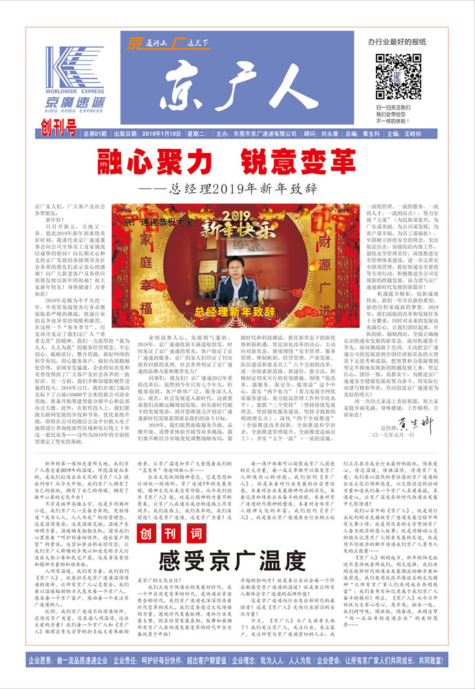 新年的第一縷陽光普照大地,我們京廣人感受著2019年的溫暖。伴隨溫暖而來的,是我們打造企業(yè)文化的《京廣人》報出刊啦!從今天開始,我們京廣人擁有了自己的報紙,擁有了自己的傳媒,擁有了敞開心扉的文化平臺!
