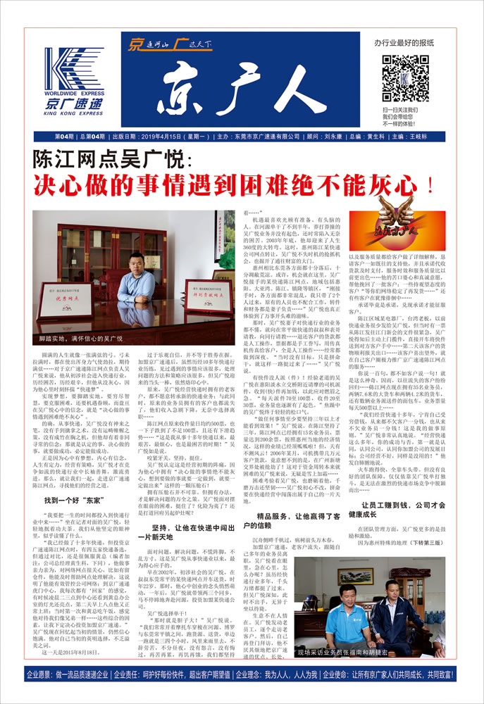 我為人人,人人為我。這是我們京廣人一貫遵循的服務(wù)理念。 在京廣速遞2012年6月重組原顧利亞前,我便加入到了這個團隊。這些年來,說實在的,我們經(jīng)歷了太多的酸甜苦辣。其實在前些年,我們也做過其他的快遞網(wǎng)絡(luò),但是說真心話,做了那么多網(wǎng)絡(luò)都不如在京廣的感觸多和收獲多。以前做其他網(wǎng)絡(luò)時,就是正常的查件催件,從中心客服部的客服文員到主管,再到網(wǎng)管經(jīng)理,甚至是更上面的領(lǐng)導(dǎo),都很難去幫我們解決,我們的查件催件信息和電話無論結(jié)果怎樣都不給我們回復(fù)。