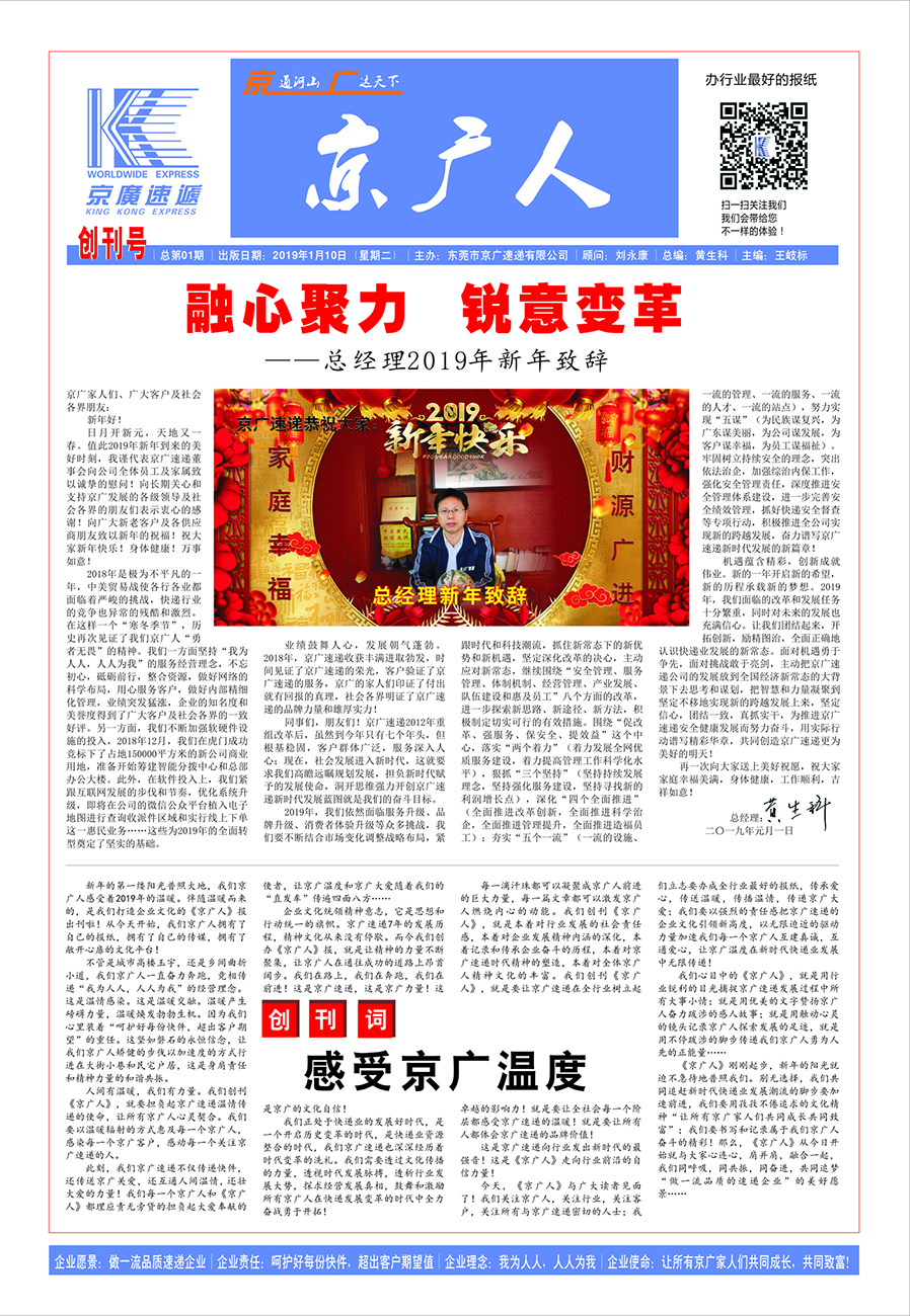帶著2019年新年濃烈的喜慶訊息,京廣速遞內(nèi)刊《京廣人》披著新年的朝陽,帶著幼芽萌發(fā)的稚氣和生機勃勃的活力,走進了您的視線。